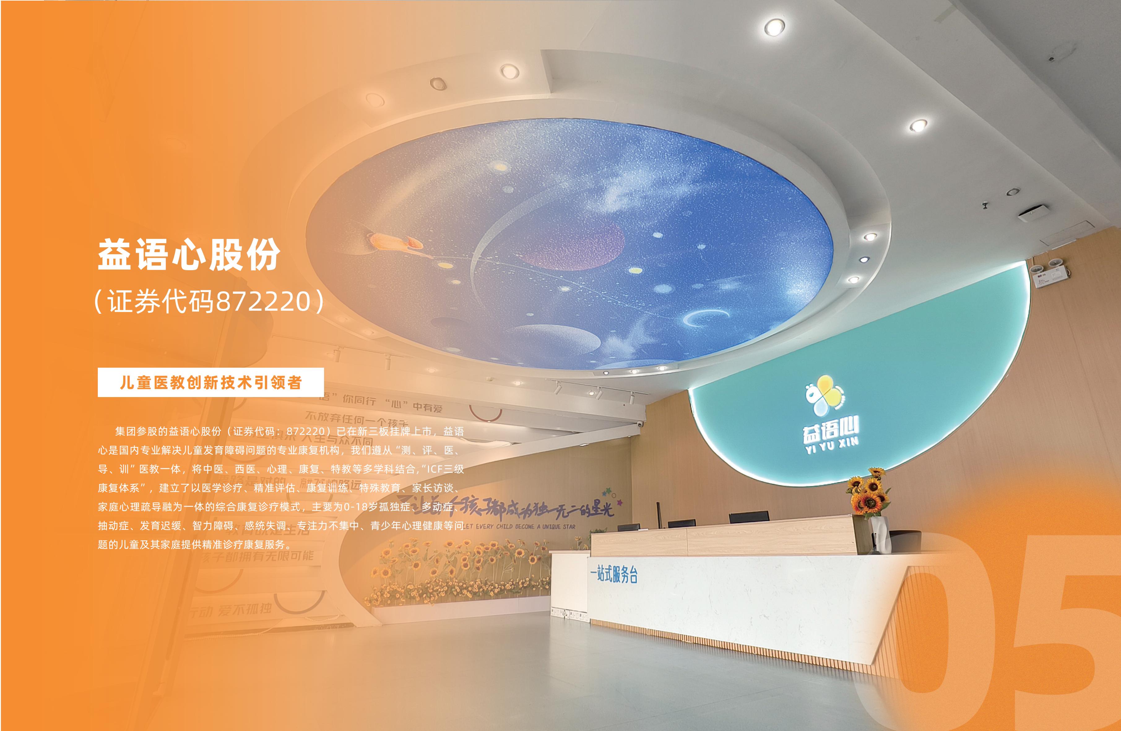 J9旗舰厅控股集團有限公司(簡稱“J9旗舰厅控股集團”)始建于2017年11月,集團總部位于山東泰安,總建筑面積七萬余平,現有員工700余人,是一家集醫(yī)、康、養(yǎng)、產、學、研于一體的綜合性健康產業(yè)集團公司。集團下設成康、醫(yī)康養(yǎng)、醫(yī)療科技、教育等事業(yè)部,通過“立足本土、放眼全球”的戰(zhàn)略布局,構建起多維度的心理康復服務體系。 集團參股的益語心股份(證券代碼:872220)已在新三板掛牌上市,益語心是國內專業(yè)解決兒童發(fā)育障礙問題的專業(yè)康復機構,我們遵從“測、評、醫(yī)、導、訓”醫(yī)教一體,將中醫(yī)、西醫(yī)、心理、康復、特教等多學科結合,“ICF三級康復體系”,建立了以醫(yī)學診療、精準評估、康復訓練、特殊教育、家長訪談、家庭心理疏導融為一體的綜合康復診療模式,主要為0-18歲孤獨癥、多動癥、抽動癥、發(fā)育遲緩、智力障礙、感統失調、專注力不集中、青少年心理健康等問題的兒童及其家庭提供精準診療康復服務。目前業(yè)務已經拓展到浙江、江蘇、廣東等地。